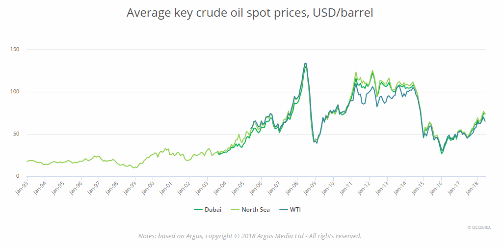 Průměrná spotová cena ropy WTI byla v lednu 2018 63,67 USD za barel ropy (cca 1 446 korun), v červnu 2018 pak 65,20 USD (cca 1 481 korun). Nejnižší cena WTI za posledních 10 let byla 31,57 USD/barel (cca 717 korun) v lednu 2016 a nejvyšší v červenci 2008 133,38 USD/barel (cca 3 029 korun).