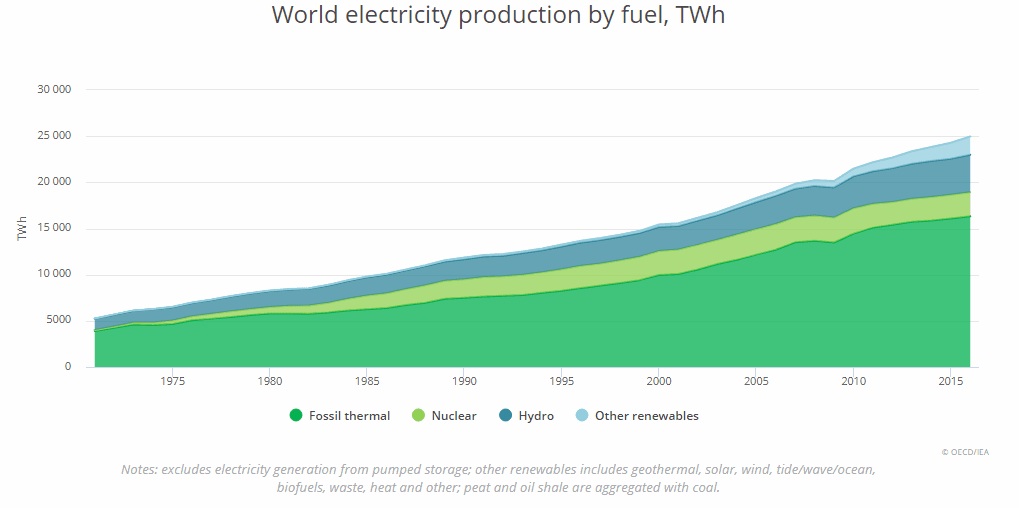 Světová výroba elektřiny dle paliv v letech 1971 – 2016. Zdroj: OECD/IEA
