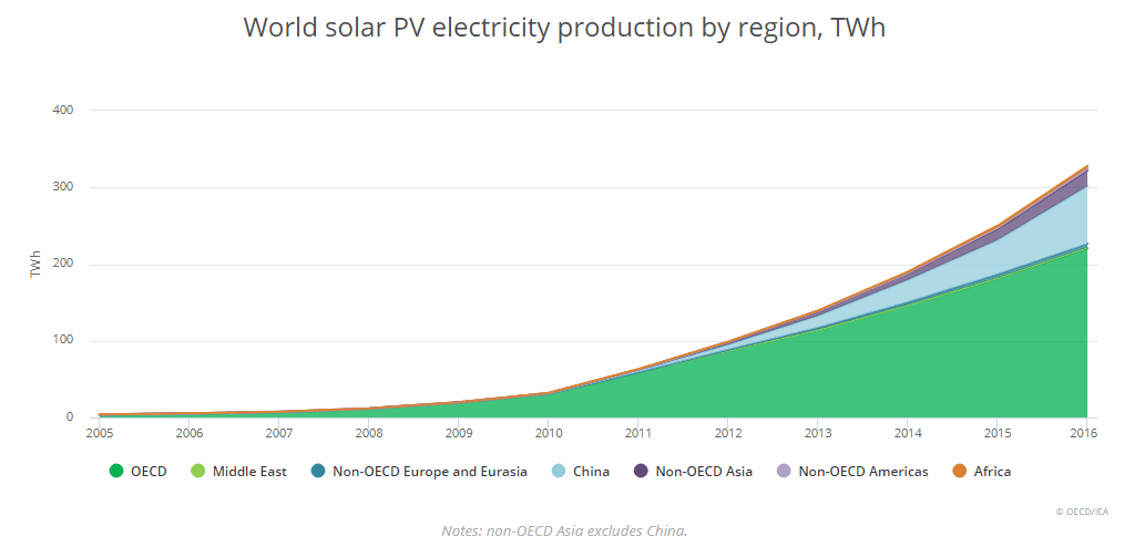 Světová výroba elektřiny v solárních elektrárnách v letech 2005 – 2016. Zdroj: OECD/IEA