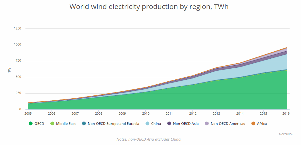 Světová výroba elektřiny ve větrných elektrárnách v letech 2005 – 2016. Zdroj: OECD/IEA
