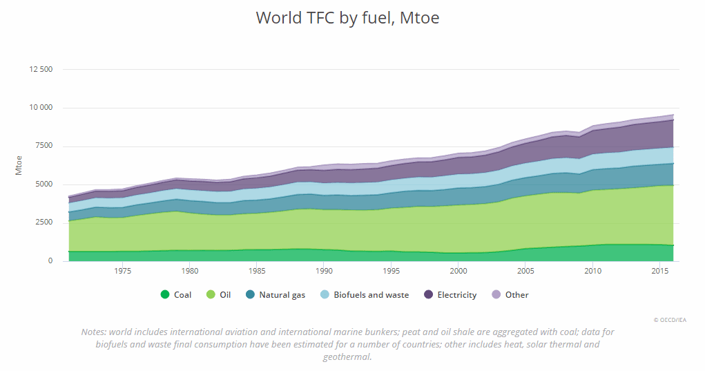 Globální celková finální spotřeba energie byla v roce 2016 1 036 Mtoe uhlí (cca 10,8 %), 3 908 Mtoe ropy (40,9 %), 1 440 Mtoe zemního plynu (15 %), 1 051 Mtoe biopaliv a odpadu (11 %), 1 794 Mtoe elektřiny (18,8 %) a 327 Mtoe jiných zdrojů (3,4 %).