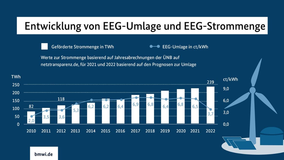 Příspěvek na podporu OZE v Německu letos činí 6,5 centu za kWh (1,67 koruny/kWh). Němečtí provozovatelé přenosové soustavy nyní stanovili jeho výši pro rok 2022, která dosáhne na 3,723 centu/kWh (0,96 koruny/kWh). Jeho snížení o 43 % bylo možné díky tomu, že v tomto roce vzrostly ceny elektřiny na burze, což znamená nižší potřebu podpory OZE, která je podporovaným zdrojům vyplácena v případě, že velkoobchodní cena elektřiny je nižší než jejich garantovaná výkupní cena.