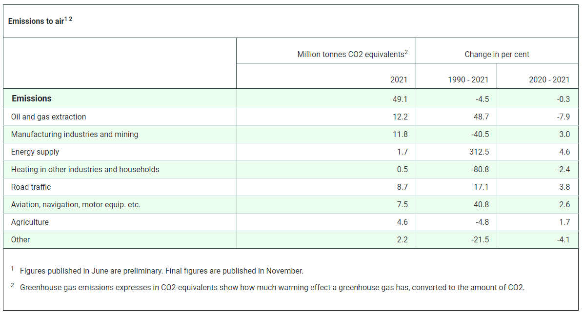 Emise skleníkových plynů v Norsku v roce 2021 dle zdrojů. Procentuální srovnání roku 2021 s roky 1990 a 2020. Zdroj: Norský statistický úřad (Statistisk sentralbyrå)