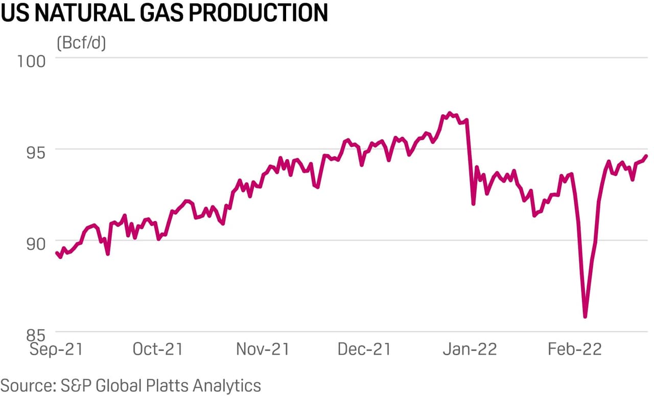 Podle prvních odhadů agentury Platts činila 22. února těžba v USA více než 94,6 miliardy kubických stop (bcf) denně, tedy 2,68 miliard metrů krychlových (bcm), což je nové sedmitýdenní maximum. Na začátku nového roku se těžba plynu v USA propadla z prosincových hodnot dosahujících v průměru 95,7 bcf/d (2,71 bcm/d).Novoroční pokles, který je na začátku ledna běžný, byl v uplynulých sedmi týdnech umocněn rozsáhlými mrazy v Texasu a centrální části USA. Největší zásah do těžby přišel na začátku února, kdy se celková produkce nakrátko propadla na pouhých 85,8 bcf/d (2,43 bcm/d).