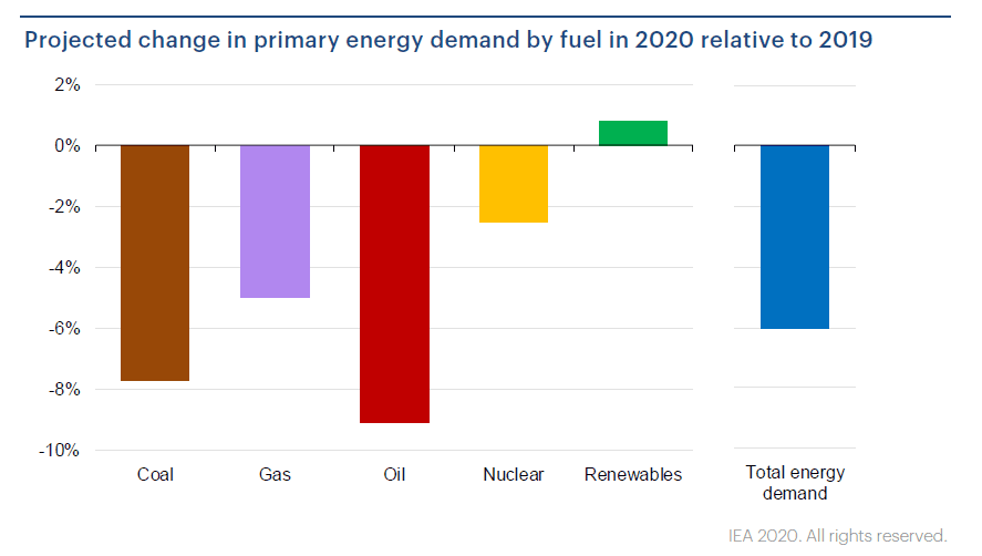 Mezinárodní energetická agentura (IEA) v důsledku pandemie koronaviru a jejích dopadů na energetické trhy vydala zprávu o vývoji energetiky za první měsíce roku 2020 včetně předpokladů nejbližšího vývoje pro zbytek roku. Podle dat IEA nejvíce poklesla poptávka po ropě a uhlí. Očekává, že tento trend přetrvá i po zbytek roku. Kromě obnovitelných zdrojů zažijí propad všechny ostatní druhy energie.