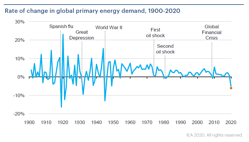 Procentuální meziroční změny v globální primární spotřebě energie v letech 1900-2020. Za rok 2020 je vyznačen IEA předpovídaný propad o 6 %. Zdroj: IEA