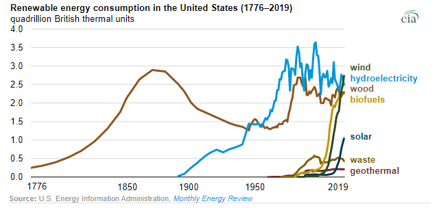 V roce 2019 bylo 20 % spotřebované energie v USA nefosilní