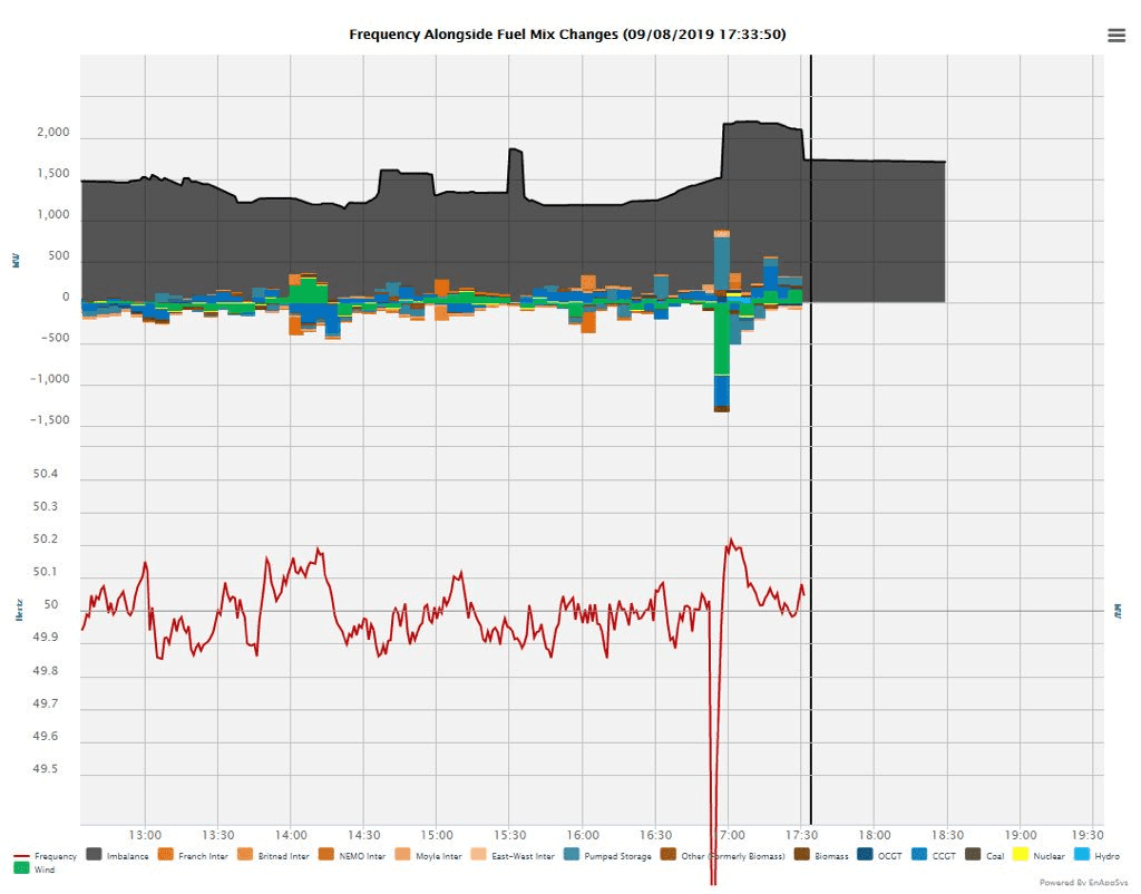 Spojené království přišlo v horizontu 2 minut mezi 16:52 a 16:54 o cca 1250 MW výkonu, když 2 minuty po výpadku paroplynové elektrárny Little Barford došlo k výpadku větrného parku Hornsea. Frekvence v elektrizační soustavě klesla v čase 16:54 na 48,8 Hz.