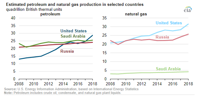 V roce 2011 Spojené státy předčily Rusko a staly se největším producentem zemního plynu. Největším producentem ropy na světě se Spojené státy staly v roce 2018, kdy předčily Saúdskou Arábii. Těžba ropy a zemního plynu je v těžebním portfoliu USA i Ruska na podobné úrovni. Saúdská Arábie naopak zásadně upřednostňuje ropu.