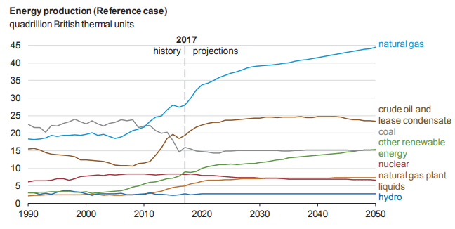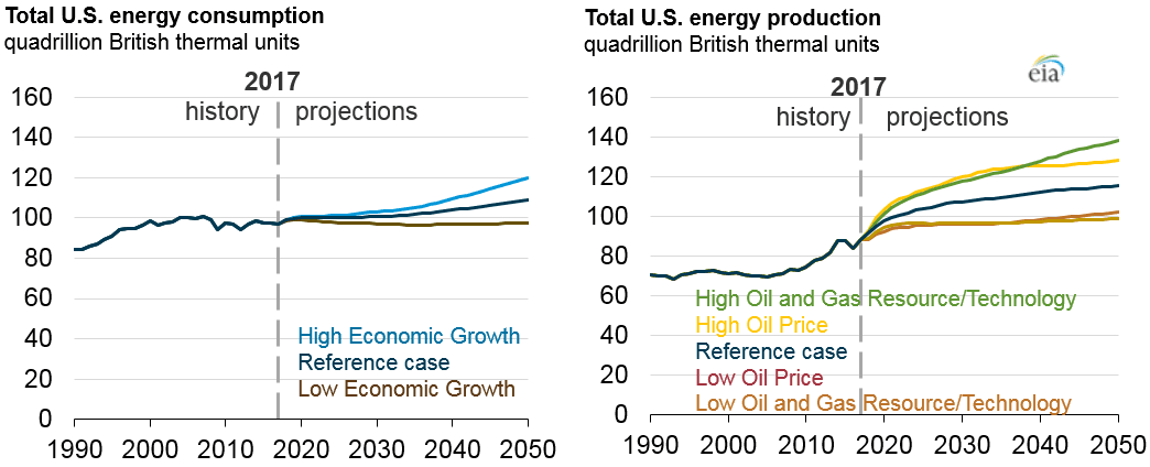 Dle EIA naroste vývoz USA díky rozšíření exportních oblastí mimo tradiční severoamerické trhy. Důležitou roli bude mít též minimální růst spotřeby energie v USA. Předpokládá se, že spotřeba energie se bude zvyšovat pouze o 0,4 % do roku 2050. Očekávání hospodářského růstu je pro stejné období 2 % za rok. Pokud se předpověď potvrdí, stane se USA čistým vývozcem energie poprvé od roku 1953.