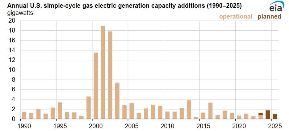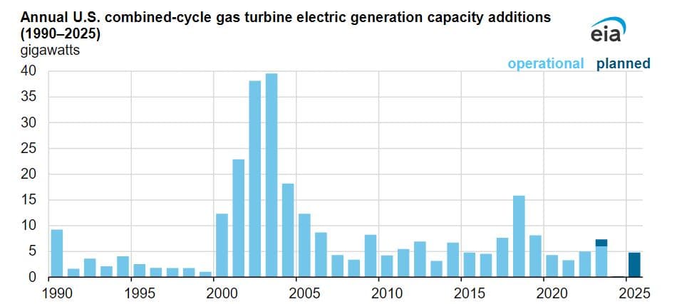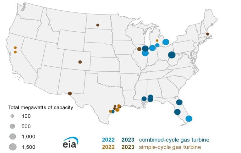 V USA bylo v letošním roce uvedeno do provozu již 10 nových elektráren spalujících zemní plyn o celkovém instalovaném výkonu 6,8 GW. Do konce roku by mělo být uvedeno do provozu dalších 6 elektráren s celkovým instalovaným výkonem 1,8 GW. Pro srovnání, v roce 2022 bylo zprovozněno 11 nových plynových elektráren s celkovým instalovaným výkonem 5,6 GW.