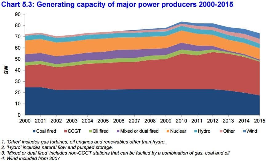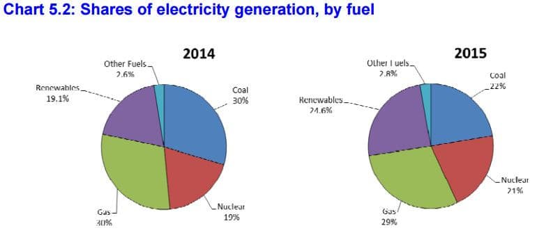 Podle oficiální zprávy Ministerstva obchodu, energetiky a průmyslu ve Spojeném království byla v roce 2015 vyrobena téměř polovina elektřiny z bezemisních zdrojů, tedy především jádra a OZE. Obnovitelné zdroje navíc poprvé v historii překonaly výrobou elektřiny i uhelné elektrárny a zároveň dosáhly na historicky nejvyšší podíl výroby elektřiny.