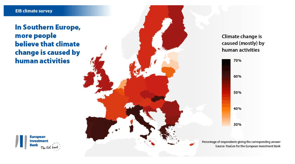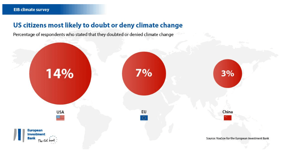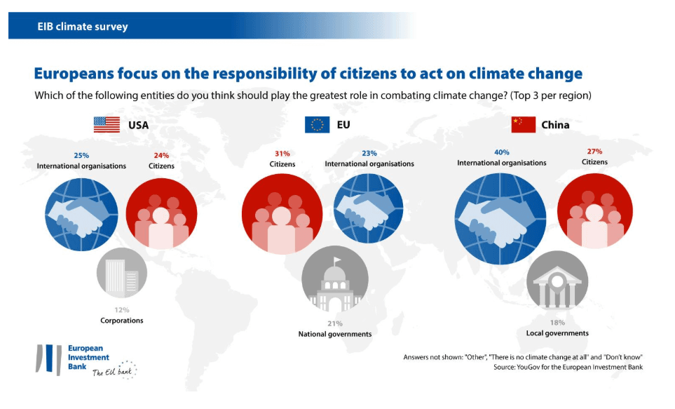 Evropská investiční banka (EIB) ve spolupráci s výzkumnou společností YouGov provedla veřejný průzkum s 25 tisíci občany členských zemí EU, USA a Číny týkající se změny klimatu. Dle výsledků průzkumu mají občané těchto zemí podobné postoje k tématům týkajícím se klimatu.