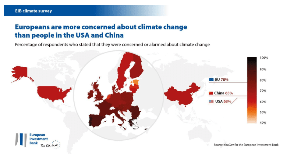 Při srovnání občanů EU, USA a Číny se Evropané mnohem více obávají negativních dopadů klimatické změny. 78 % Evropanů říká, že jsou znepokojení nebo mají obavy z klimatické změny. V Číně to bylo 65 % dotazovaných a 63 % v USA.