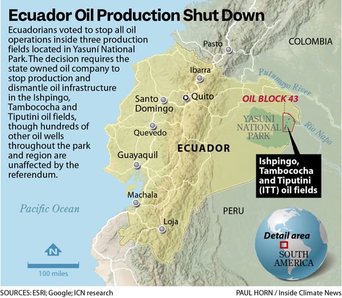 Druhý zmínění hodný milník je z letošního roku, kdy bylo dosaženo vyhlášení celostátního referenda, které se týkalo zastavení těžby v ropných polích Ishpingo, Tambococha a Tiputini (ITT). Ty se nacházejí v národním parku Yasuní. Referendum vyšlo ve prospěch ukončení těžebních prací, pro které se vyslovilo 59 procent voličů. Vláda společně se státní ropnou společností Petroecuador se tak zavázaly k vyhovění výsledkům referenda s jednoroční lhůtou.